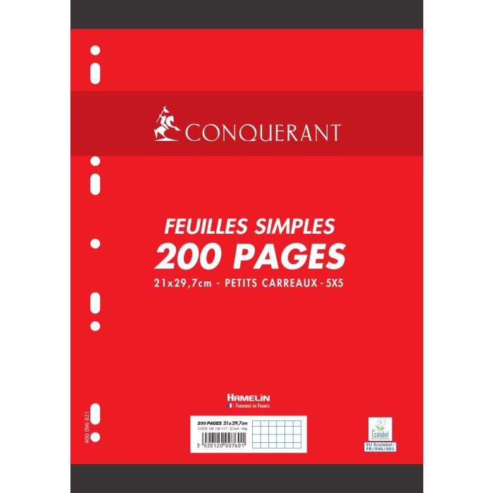 Feuilles simples blanches perforées, 210 x 297 mm, à petits carreaux pour le collège et le lycée en lot de 100 CONQUERANT. Numéro article 100103536