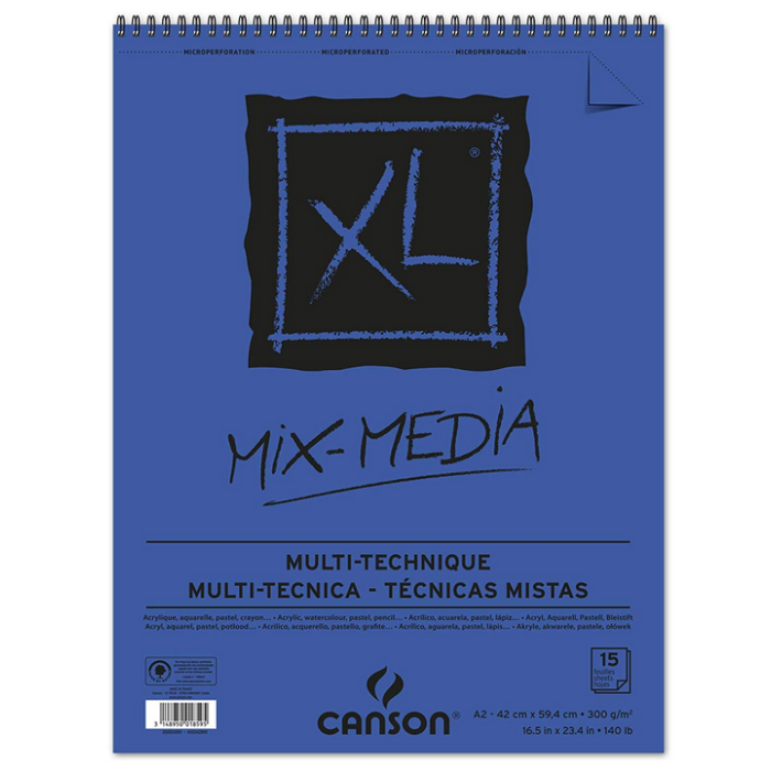 Bloc Canson XL MIX MEDIA de 15 feuilles A2 pour dessin adapté aux techniques pures ou mixtes à base d'aquarelle, gouache, acrylique. Numéro article C200001859