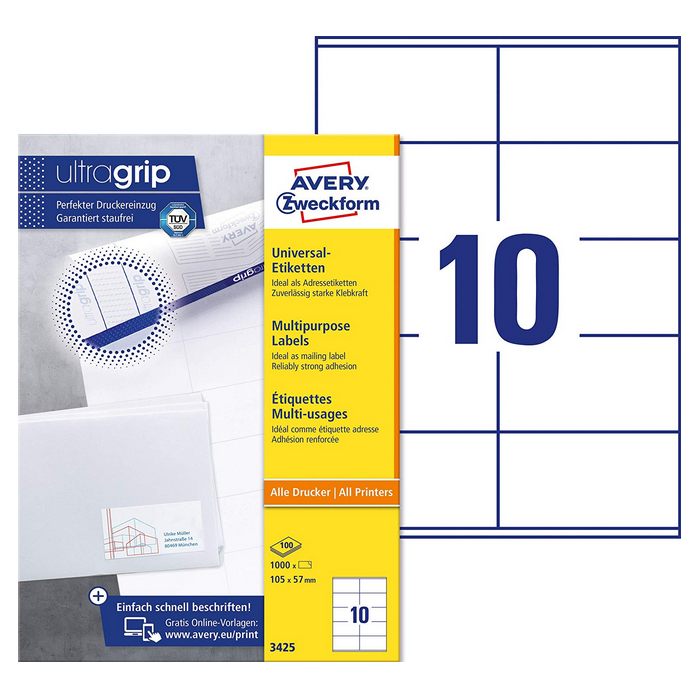 Étiquettes adhésives 105 x 57 mm écologiques pour des enveloppes et un marquage de qualité de marque AVERY. Numéro article 3425