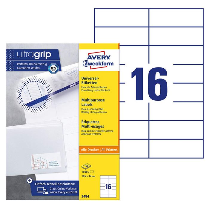 Étiquettes adhésives écologiques 105 x 37 mm pour Enveloppes et un marquage de qualité AVERY. Numéro article 3484