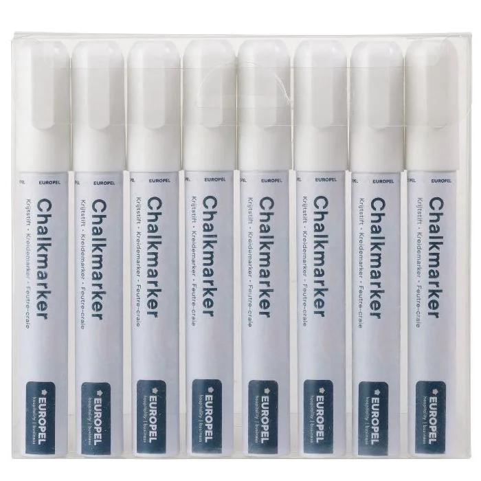 Etui de 8 marqueurs à craie Blanc pour écrire et dessiner toutes surfaces de 6 mm d'Europel pour décorer toutes surfaces (Tableau, Vitre, etc.). Numéro article 356503