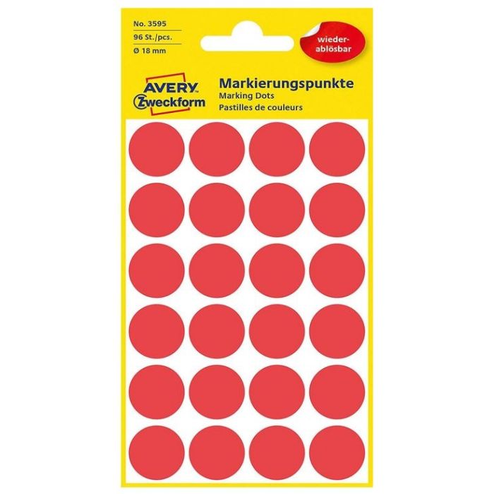 Etiquettes autocollantes rondes Rouges 18 mm d'Avery, gommette amovible de marquage et de signalisation de produit. Numéro article 3595