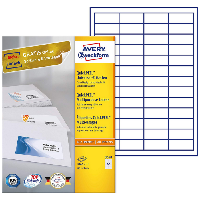 Étiquettes autocollantes à imprimer 48 x 21 mm d'AVERY, écologiques pour un marquage de qualité. Numéro article 3650