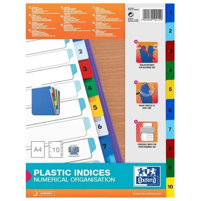 Intercalaires A4 à chiffres de 1 à 10 d'OXFORD pour classeur et tri. Numéro article 400013907
