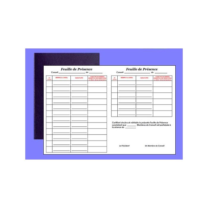 2 pages sont prévues par réunion. Le président et un membre du conseil contresignent la feuille de présence.