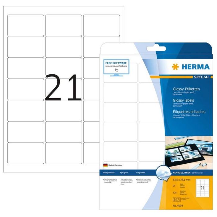 Étiquettes adhésives brillante 63,5 x 38,1 mm pour une impression en qualité photo HERMA. Numéro article 4904 H