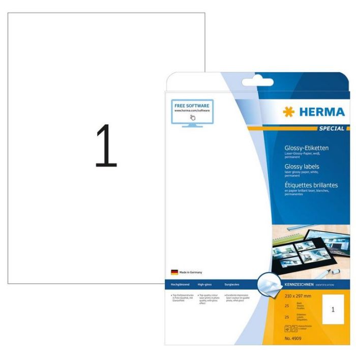Étiquettes adhésives A4 brillante pour une impression en qualité photo d'Herma. Numéro article 4909