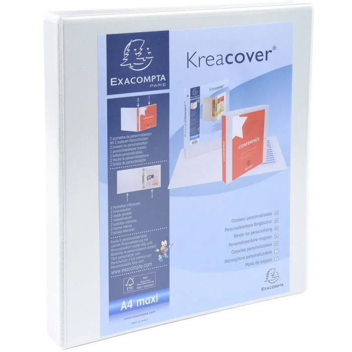 Classeur Blanc personnalisable dos de 38 mm avec 2 pochettes extérieures et 2 anneaux EXACOMPTA. Numéro article 54940E