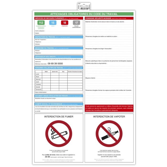 - Permet l'affichage des mentions obligatoires du code du travail.