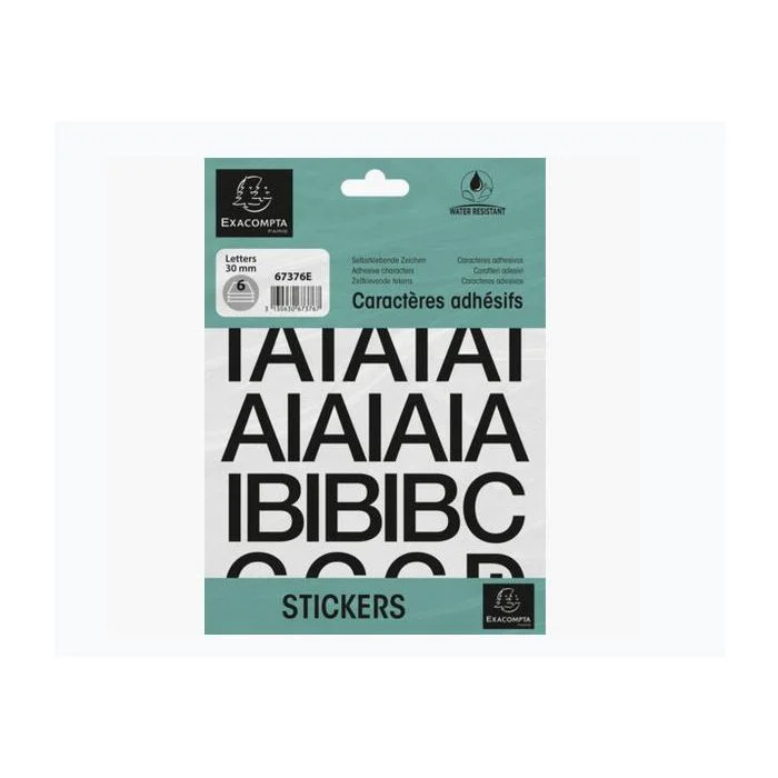 Lettres adhésives de A à Z, hauteur 30 mm, idéal pour personnaliser vos vitrines, boîtes aux lettres, portes ou encore poubelles EXACOMPTA. Numéro article 67376E