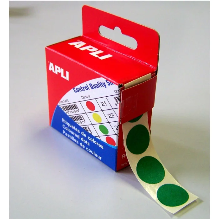Boîte de 150 pastilles vertes 15 mm autocollantes d'APLI. Numéro article 115006