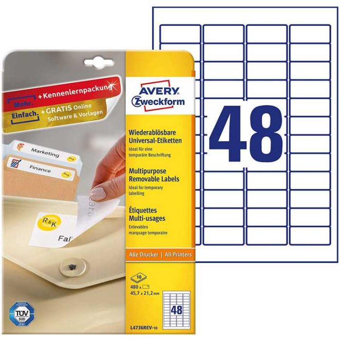 Planche d'étiquettes adhésives repositionnables 45,7 x 21,2 mm d'AVERY pour marquer et identifier les objets et produits. Petit Paquet. Numéro article L4736REV-10