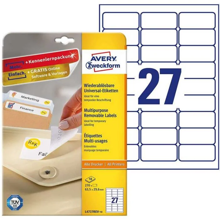 Planche d'étiquettes adhésives repositionnables 63,5 x 29,6 mm d'AVERY pour marquer et identifier les objets et produits. Petit paquet. Numéro article L4737REV-10