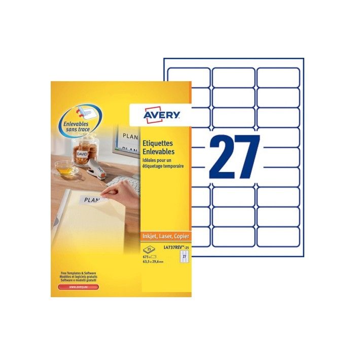 Planche d'étiquettes adhésives repositionnables 63,5 x 29,6 mm d'AVERY pour marquer et identifier les objets et produits. Numéro article L4737REV-25