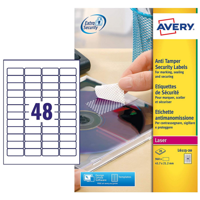 Etiquettes de sécurité adhésives en film plastifié - 45,7 x 21,2 mm - Blanc AVERY Lot de 960