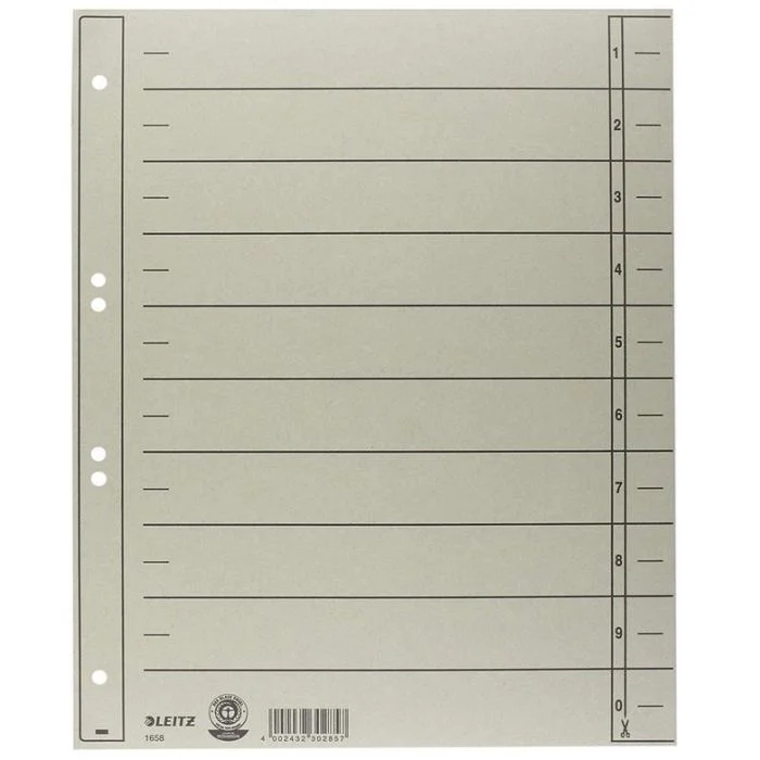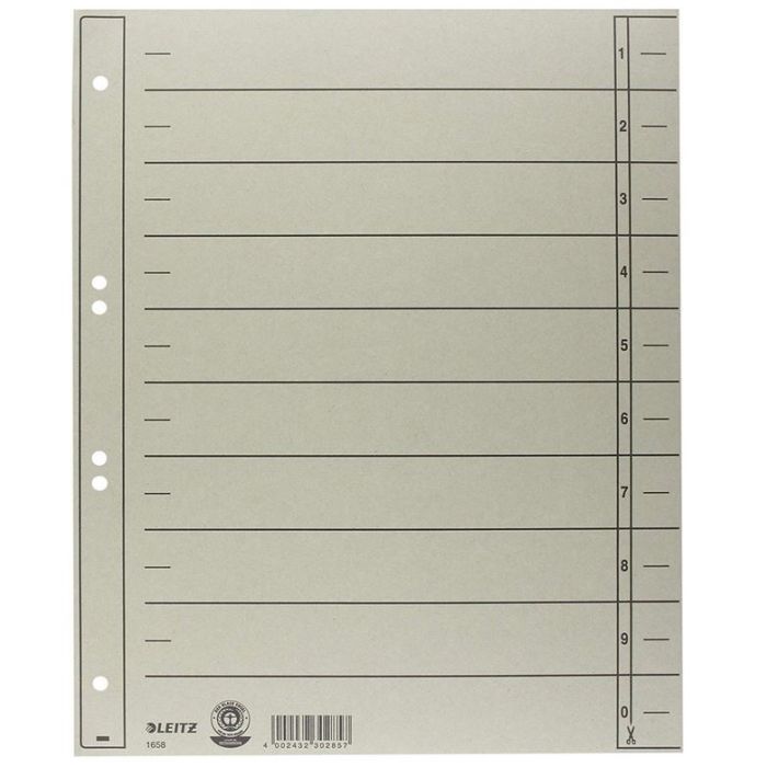Intercalaires perforés gris en carton 230 g/m2, format 240 x 300 mm, pour classeur de LEITZ. Numéro article 1658-00-85